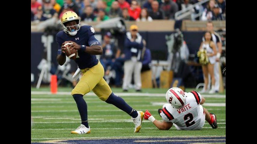 Wimbush was Notre Dame's starter the first three games before getting replaced by junior Ian Book. Wimbush started 12 games last year, when he became only the third quarterback in school history with more than 1,000 yards passing (1,870) and 500 yards rushing (803) in the same season.