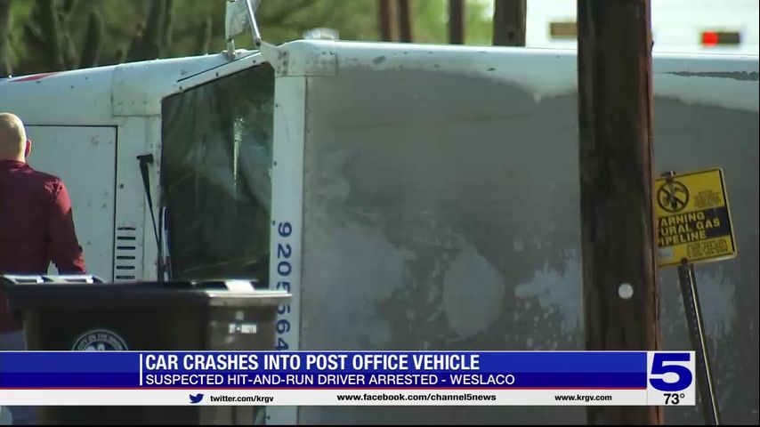 The USPS truck was hit from behind by a Chevy Malibu vehicle that fled the scene of the crash near Pike Boulevard and FM 1015 at around 10 a.m., police said.
