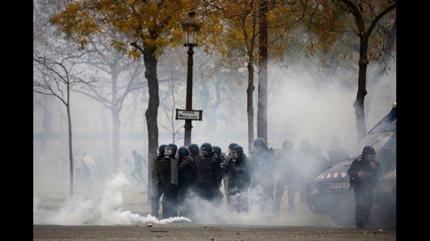 Some demonstrators removed the barriers protecting the Tomb of the Unknown Soldier from World War I under the Arc de Triomphe monument to pose near its eternal flame and sing the national anthem. An Associated Press reporter at the scene saw other protesters and a soldier intervene to disperse the troublemakers and protect the flame. Police later fired tear gas in the area.
